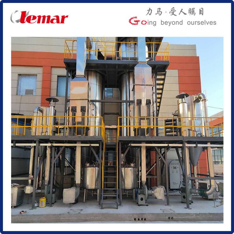 常州力馬干燥工程有限公司在利用噴霧干燥機(jī)對固含量50%左右的甜菊糖甙料液進(jìn)行干燥時(shí),積累了豐富的經(jīng)驗(yàn)。針對甜菊糖甙終產(chǎn)品的特點(diǎn),機(jī)組的收料系統(tǒng)采用了獨(dú)特的冷凍除濕冷風(fēng)冷卻收料裝置,既保證物料瞬間離開高溫區(qū)域避免物料軟化而得到冷卻,又可避免物料在濕度較高的環(huán)境下吸濕等現(xiàn)象。