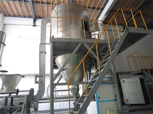 酶制劑專(zhuān)業(yè)干燥工程曾由國(guó)內(nèi)酶制劑領(lǐng)域權(quán)威專(zhuān)家與我司銷(xiāo)售人員共同進(jìn)行多次工藝試驗(yàn),利用LPG-5型高速離心噴霧干燥機(jī)(每小時(shí)蒸發(fā)5公斤水)作為試驗(yàn)裝備,對(duì)進(jìn)出風(fēng)溫度、風(fēng)量風(fēng)壓匹配、超溫臨界報(bào)警、進(jìn)出料平衡等都做了多次論證,更好地指導(dǎo)了大型噴霧干燥設(shè)備的工藝設(shè)計(jì)。針對(duì)酶制劑吸濕性強(qiáng)等特性做了設(shè)備結(jié)構(gòu)改進(jìn),融入了防粘掃壁的新技術(shù),并能實(shí)現(xiàn)同步冷卻和連續(xù)收料等工藝需求。