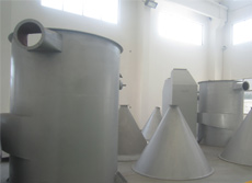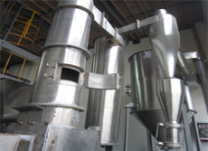 空氣經(jīng)過加熱器被加熱至~230℃左右,進入旋轉(zhuǎn)閃蒸干燥機。濕料由輸送裝置送入螺旋加料機構,螺旋加料器可無級調(diào)速。物料經(jīng)擠壓后強制進入主塔,隨即被高速旋轉(zhuǎn)而又具有不同角度的刀片粉碎,又被高速進入旋轉(zhuǎn)閃蒸干燥機主塔的高溫氣流沖擊高速旋轉(zhuǎn)、夾帶上升,這時氣流溫度急速下降,物料水分迅速蒸發(fā)從而完成干燥過程。被干燥的物料隨高速高溫氣流進入脈沖布袋除塵器。氣流由濾袋外部進入,向上排出,為防止濾袋積料,由脈沖電磁閥定時、輪流由各濾袋上部輸入高壓氣流(0.5~0.6Mpa),反復反沖濾袋,以達到*佳除塵效果。