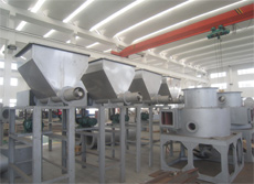 熱空氣由主機底部進風口切向進入閃蒸干燥機主塔、在閃蒸干燥機主塔內(nèi)形成螺旋形的上升高速旋轉(zhuǎn)氣流,同時根據(jù)不同的物料性質(zhì)調(diào)整底部環(huán)隙大小,使風速處于合適的狀態(tài)。物料經(jīng)螺旋加料器直接進入閃蒸干燥塔,在高速氣流的沖擊和帶動下,迅速分散并隨氣流作高速旋轉(zhuǎn)運動。對于比較大且潮濕的顆粒團,高速氣流不足以使之破碎并高速旋轉(zhuǎn),于是在重力作用下逐漸下落,當落到主機底部時被設置在底部的破碎裝置強行破碎并微?;?,然后隨高速氣流一并旋轉(zhuǎn)上升而完成干燥過程。為了使物料的終水分達到極低同時不受初水分的波動而影響產(chǎn)品質(zhì)量,在干燥塔內(nèi)設置多層旋流片,形成較為穩(wěn)定的流態(tài)化床,同時旋流片亦起到保證干燥所必須的停留時間和分級的作用。