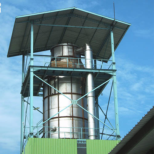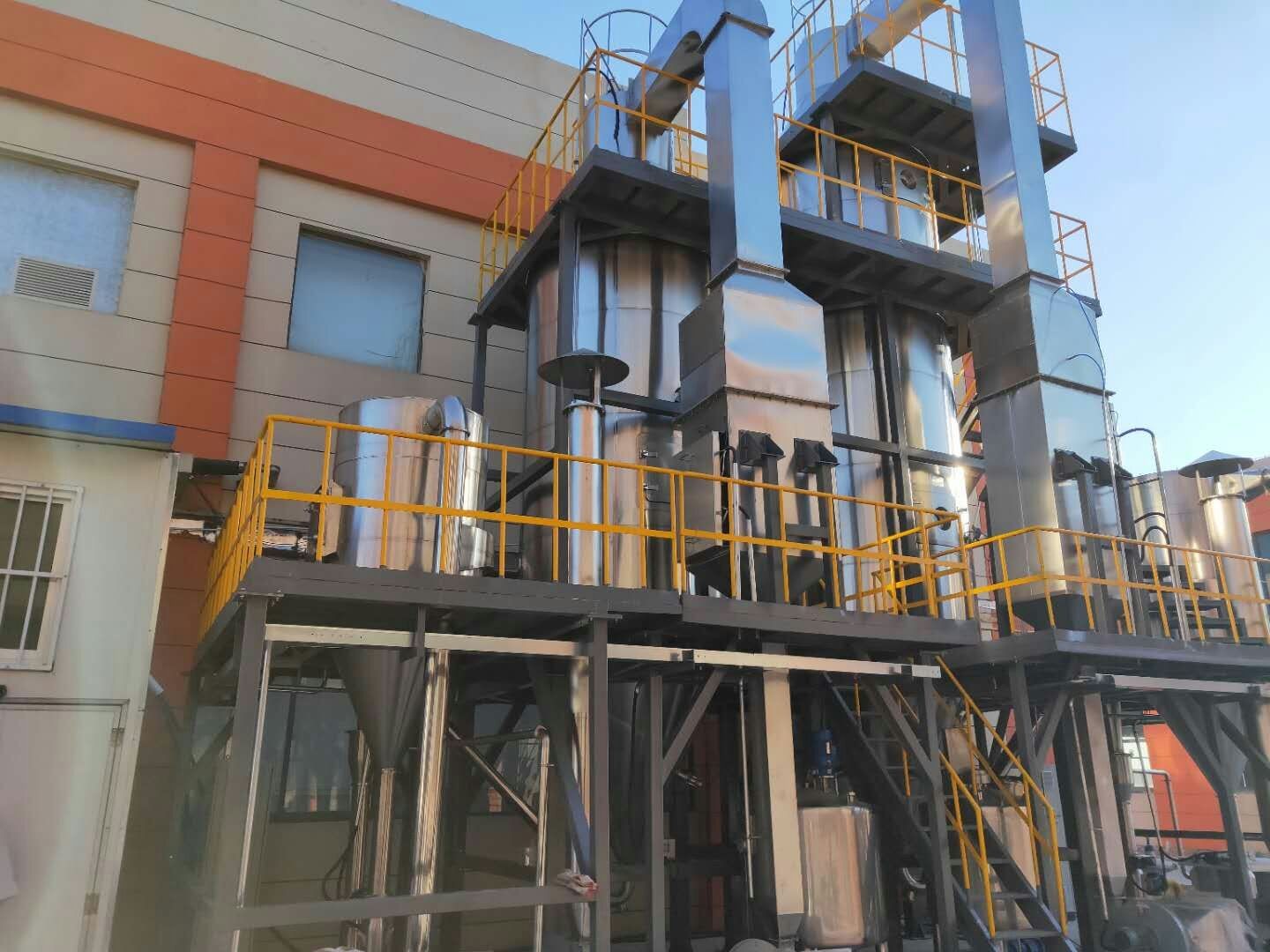 壓力噴霧干燥機(jī)工作過(guò)程為:料液通過(guò)隔膜泵高壓輸入,噴出霧狀液滴,然后同熱空氣并流下降,大部分粉粒由塔底排料口收集,廢氣及其微小粉末經(jīng)旋風(fēng)分離器分離,廢氣由抽風(fēng)機(jī)排出,粉末由設(shè)在旋風(fēng)分離器下的收粉筒收集,風(fēng)機(jī)出口處還可裝備二級(jí)除塵裝置,回收率在96%-98%。