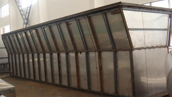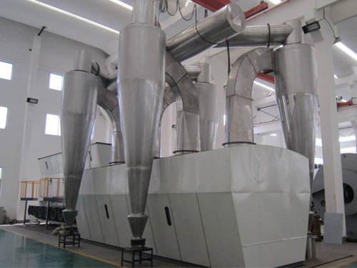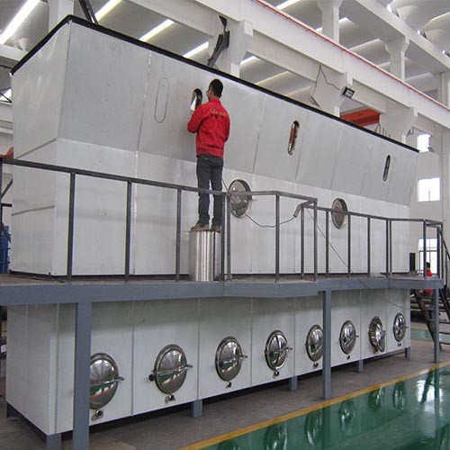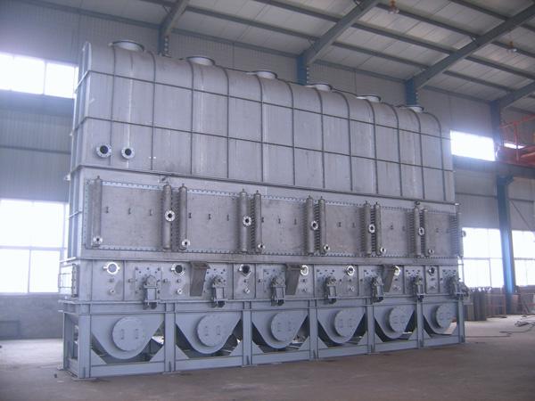 潔凈的熱風經(jīng)閥板分配進入床體內,從加料器進入的濕物料被熱風形成流化狀態(tài),如煮沸的開水在床體內跳躍,故稱為沸騰干燥器(沸騰干燥機),由于熱風與物料廣泛接觸,因此在較短的時間內就可以干燥。從床體的一頭進入,經(jīng)幾分鐘至幾十分鐘時間的“沸騰”,從床體的另一頭自動流出。