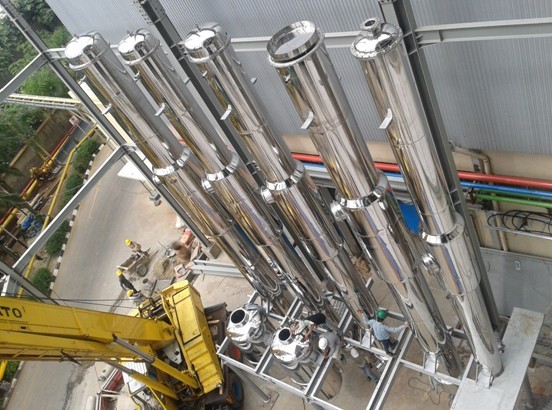 5:濃縮 濃縮一般分為真空濃縮、離心濃縮和冷凍(濃縮,這里采用真空濃縮。它通過真空降低水的沸點(diǎn),真空度達(dá)-0.08Mpa以上,此時(shí)水的沸點(diǎn)只有60度左右,從而使液體加快濃縮,濃縮液的濃度一般不超過60%(折光度計(jì))。由于從蒸發(fā)塔出來的濃縮液溫度高于常溫,因此必須經(jīng)過冷卻再送入貯罐,從而減少流失。