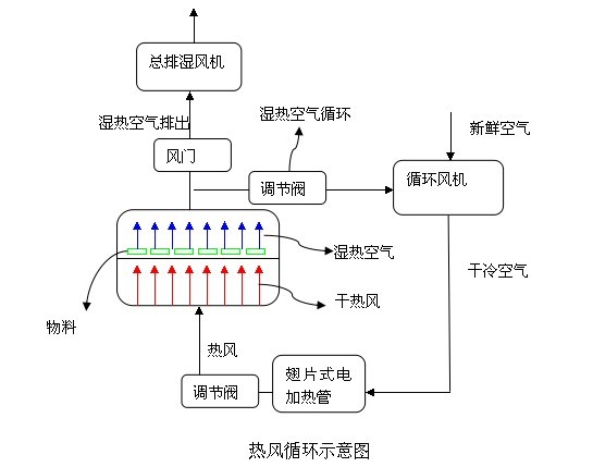 熱風(fēng)循環(huán)風(fēng)機(jī)在吸入新鮮空氣的同時(shí),吸入一部分從干燥室出來(lái)的濕熱空氣,以充分利用熱能??諝饨?jīng)過(guò)翅片式電加熱管后被加熱,送入干燥室由下往上吹送對(duì)物料進(jìn)行烘干,如圖所示。