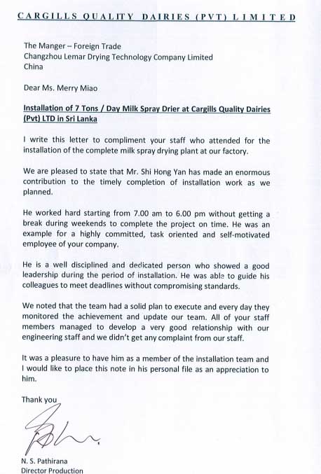 信中這樣寫道:“親愛的Merry Miao女士:我寫這封信主要是想要贊美一下你公司的這次參加了我們廠完整的牛奶噴霧干燥設(shè)備安裝的員工。我們真的很高興,特別是史洪雁先生,他在這次安裝任務(wù)中作出了巨大的貢獻(xiàn),他按照我們的計(jì)劃時(shí)間表提前完成了安裝工作。他工作很努力,每天從早晨7點(diǎn)到下午6點(diǎn),周末都沒有休息,只為了能夠按時(shí)保質(zhì)保量完成項(xiàng)目。他代表著一個(gè)致力于任務(wù)導(dǎo)向和自我激勵(lì)的公司。并且他是一個(gè)很有紀(jì)律的人,在領(lǐng)導(dǎo)小分隊(duì)安裝期間,嚴(yán)格要求自己,一直堅(jiān)持到最后完成安裝。我們還注意到,你們的團(tuán)隊(duì)計(jì)劃非常明確,每天都在監(jiān)控設(shè)備的使用情況,并對(duì)我們的人員進(jìn)行現(xiàn)場(chǎng)培訓(xùn)。你們所有的員工與我們的工程人員都相處得非常愉快,我們沒有得到任何來自我們員工的投訴。最后,我想說的是,我把史洪雁先生寫在信中,只是因?yàn)閱渭兊男蕾p這個(gè)人。”